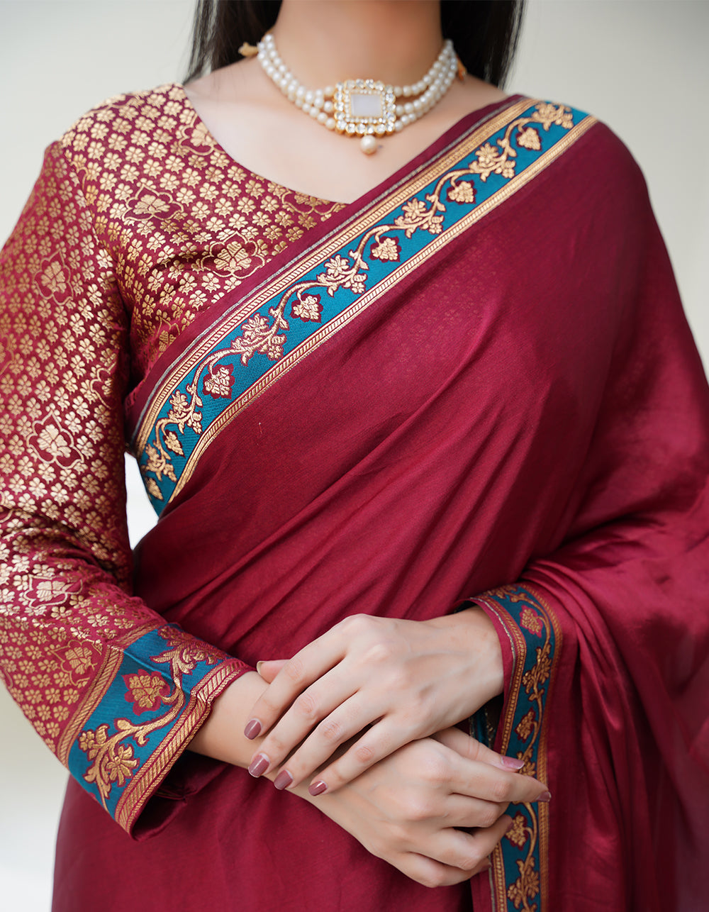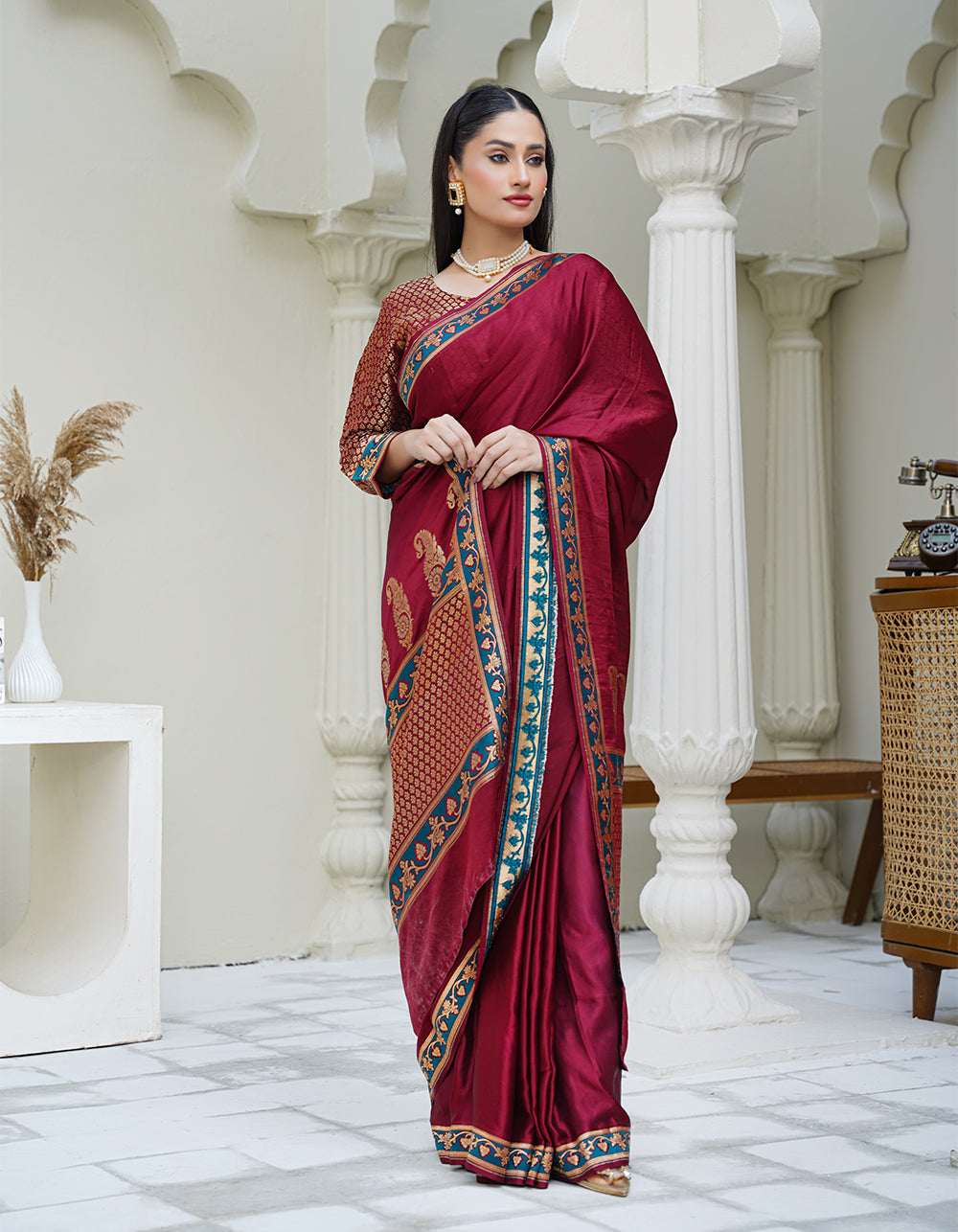 A deep reddish-maroon saree with a graceful plain pallu border that adds timeless charm. Accented with resham and zari details, it blends tradition with refined sophistication.