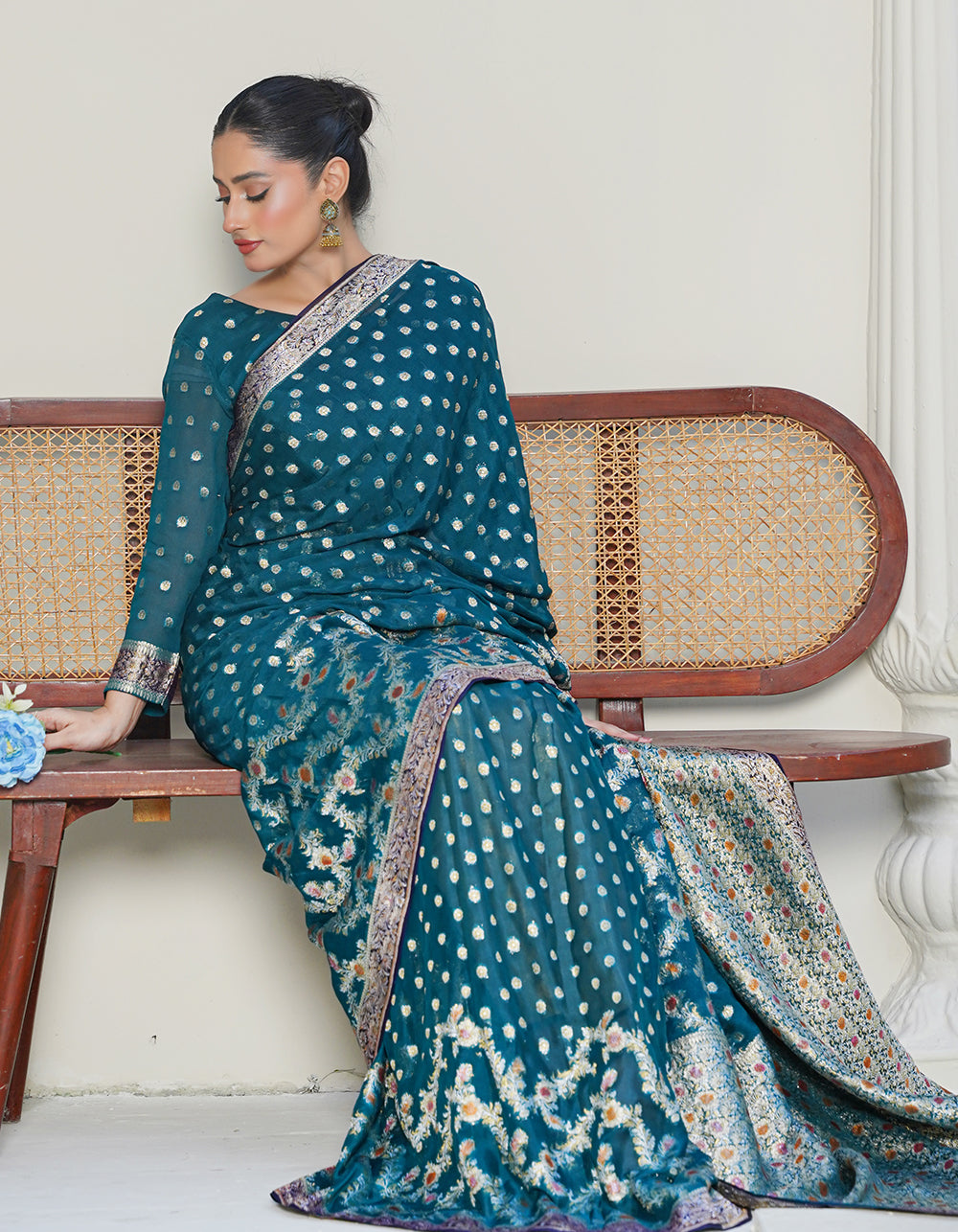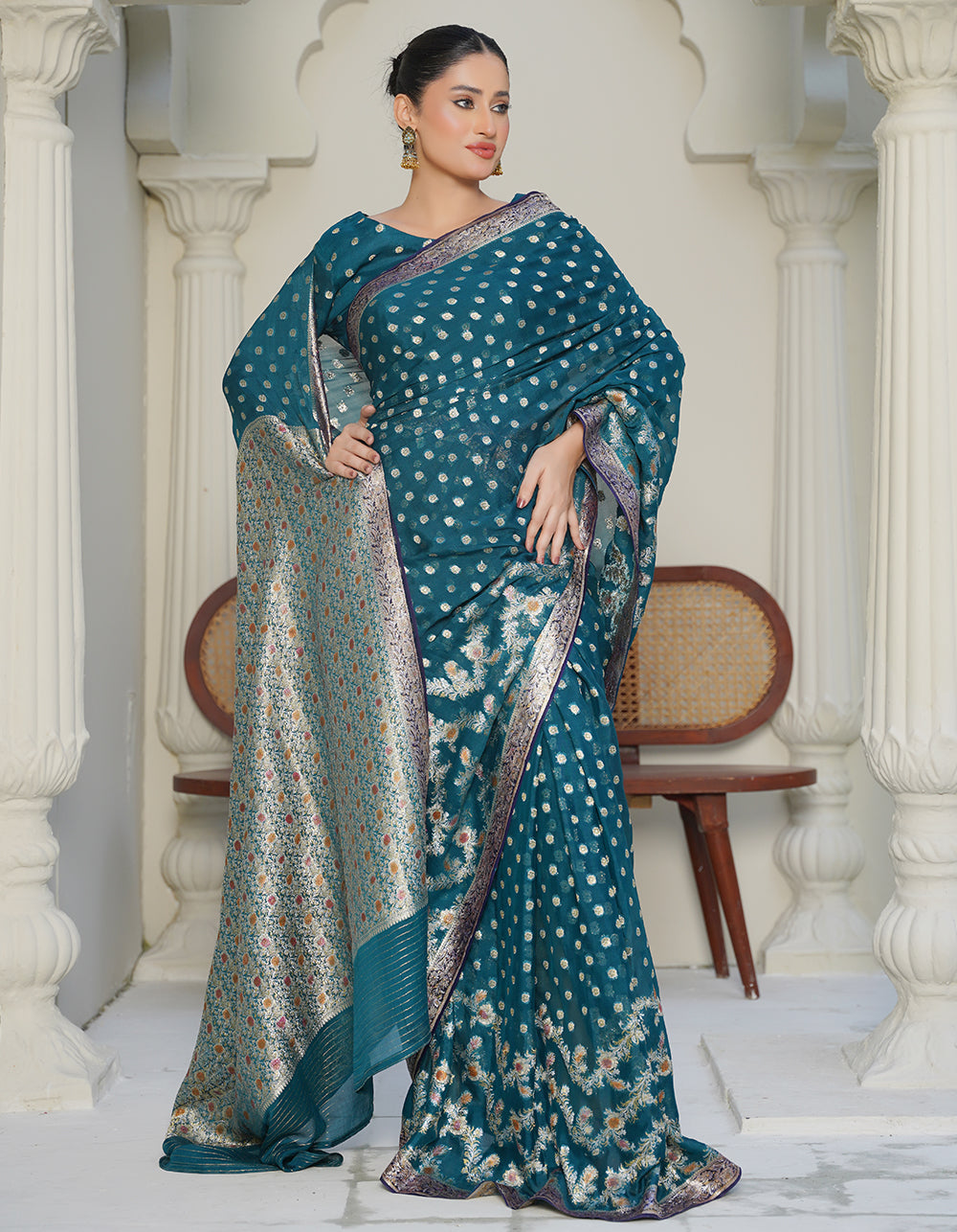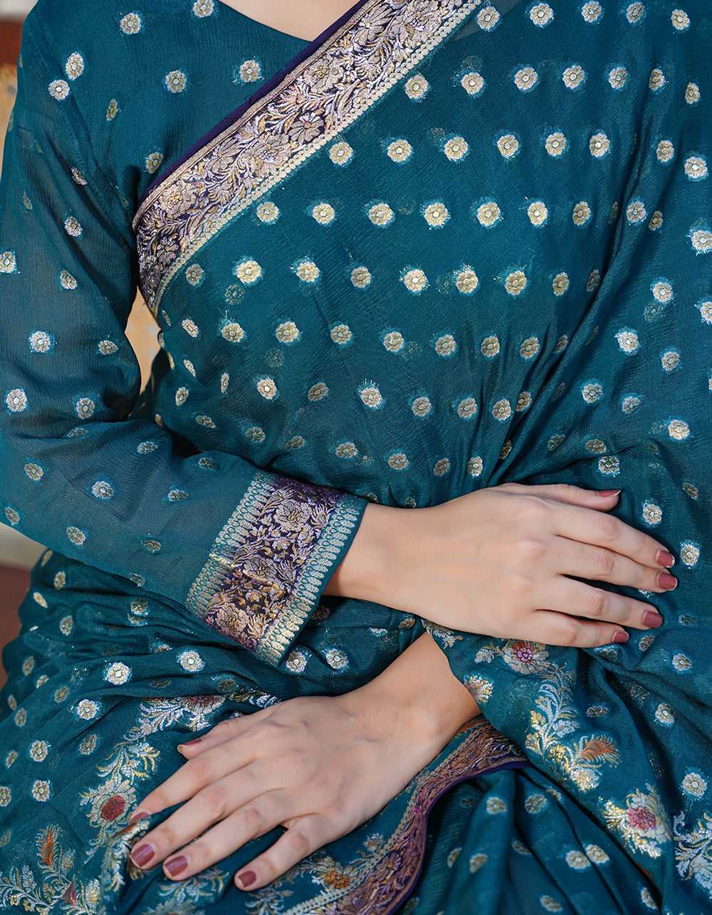 A refreshing teal green saree showcasing exquisite Ganga-Jamna zari craftsmanship. Multi hand-paint elements elevate its traditional beauty with artistic strokes.