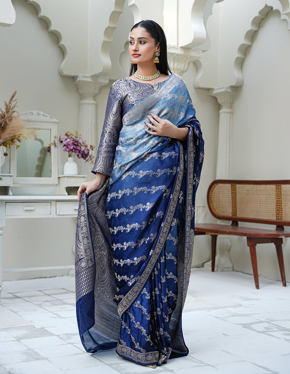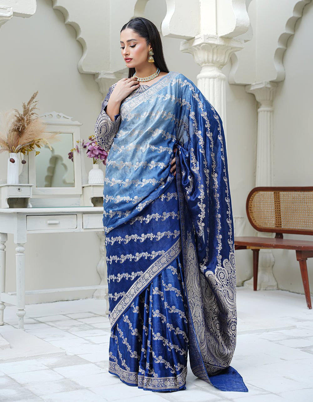 A soft pista green formal suit featuring classic Banarasi craftsmanship with borrowkade zari. Multi-thread detailing adds richness and depth to its refined look.