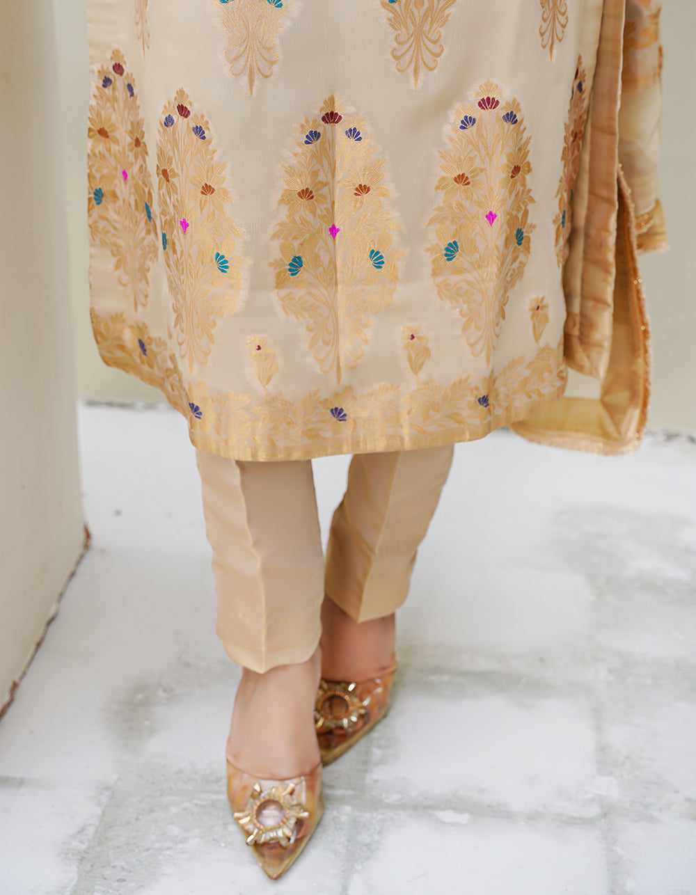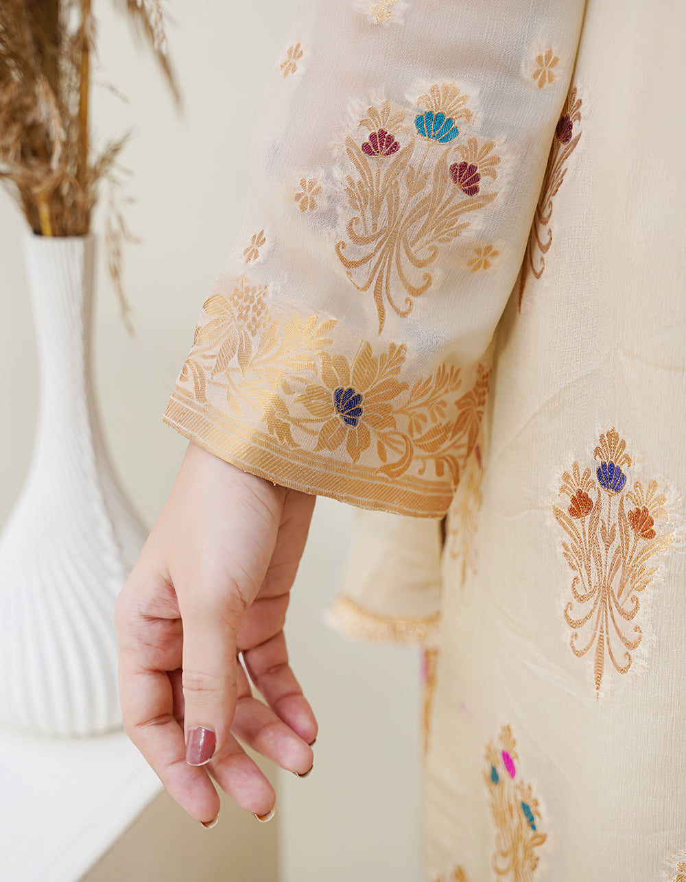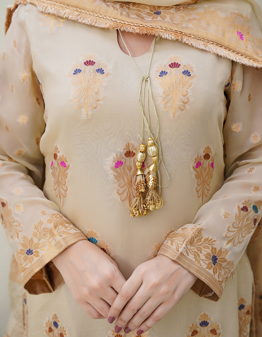 A timeless light-gold ensemble adorned with Indian gold zari for a traditional luminous effect. Multi-thread accents elevate its graceful Banarasi texture.