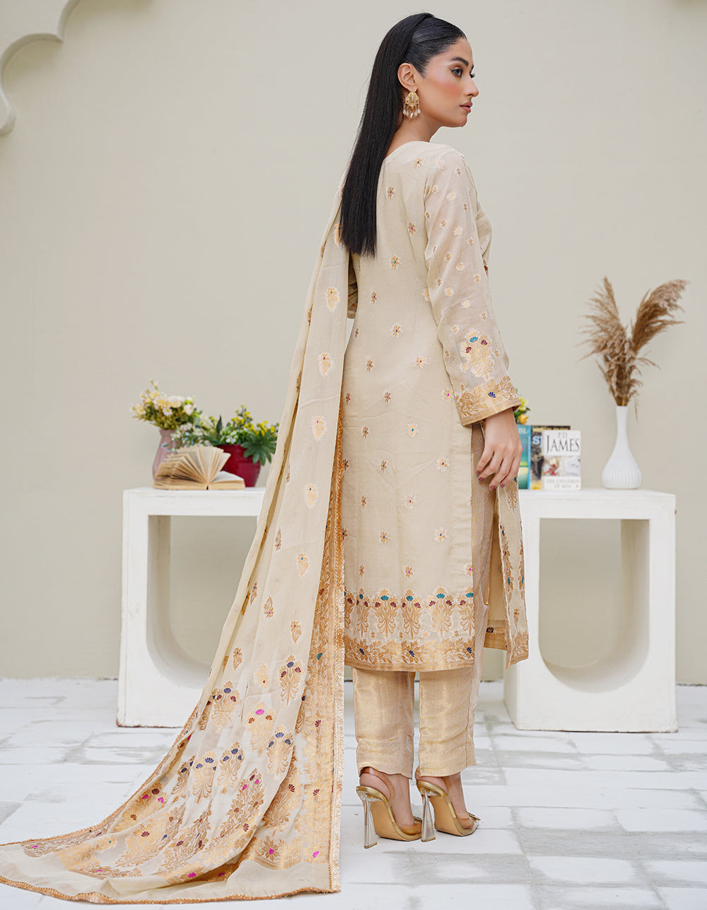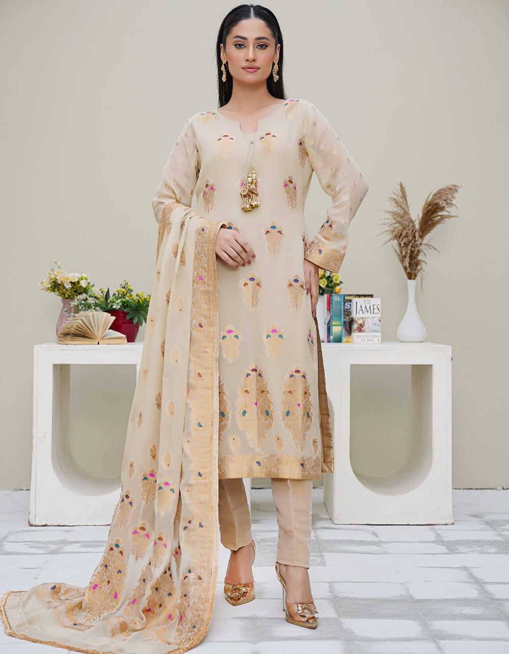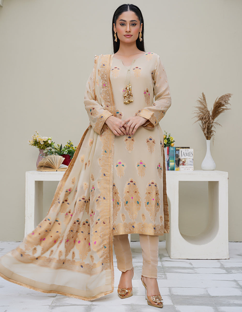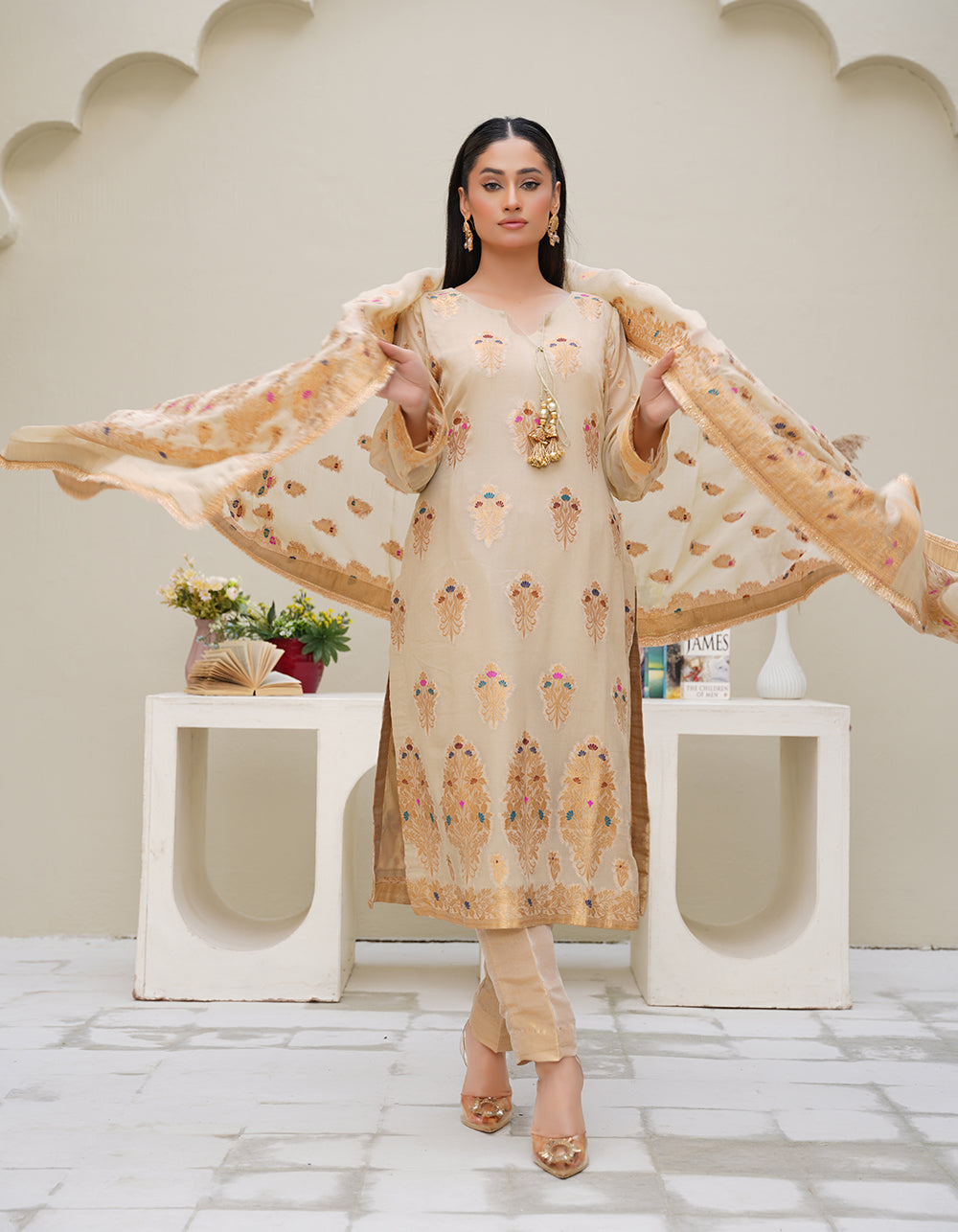 A timeless light-gold ensemble adorned with Indian gold zari for a traditional luminous effect. Multi-thread accents elevate its graceful Banarasi texture.