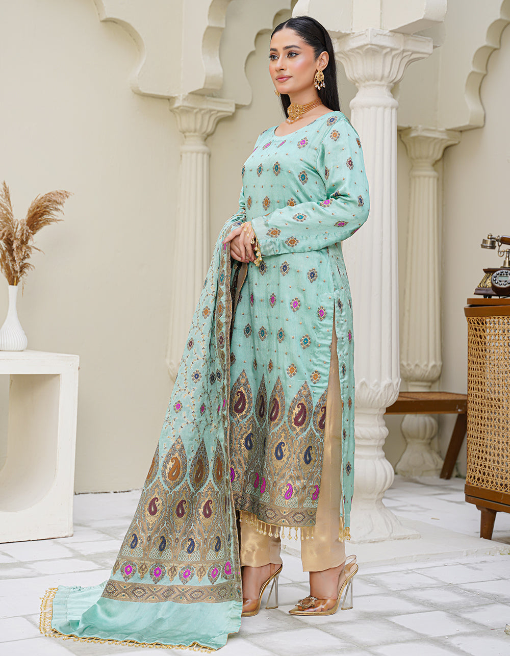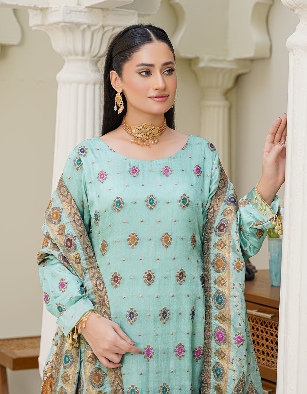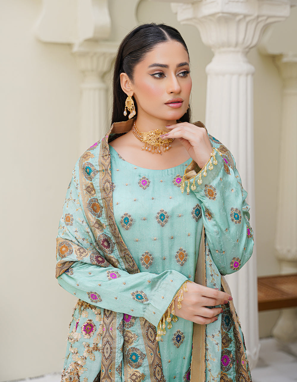 A refreshing aqua-toned suit with elegant daman multi-thread and zari work. Paired with a Mughal-style shawl that enhances its regal aesthetic.