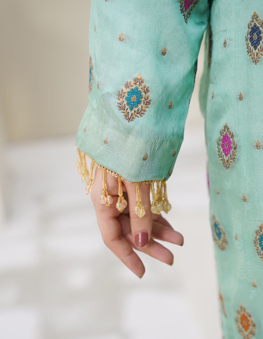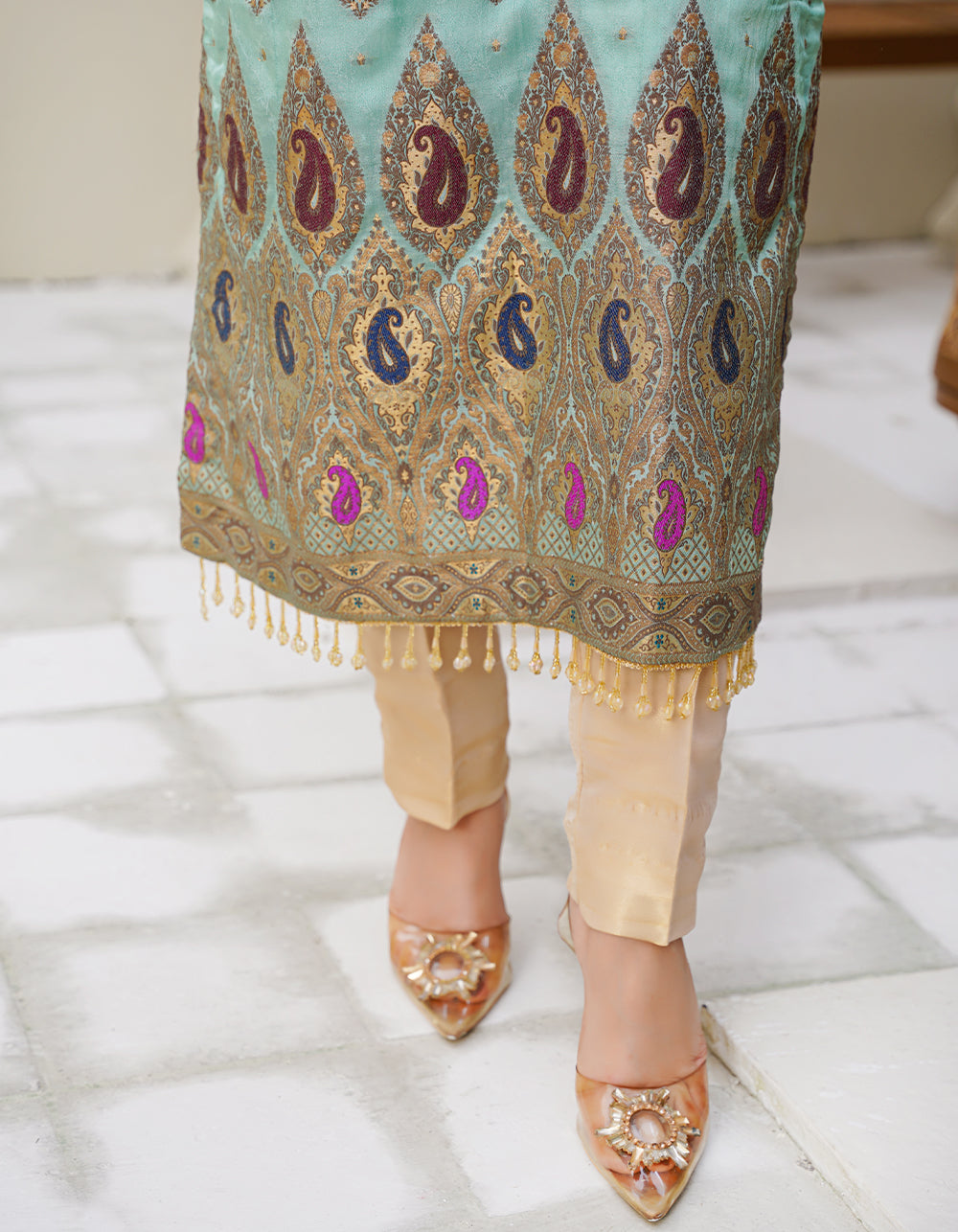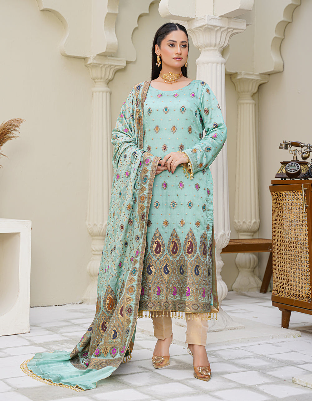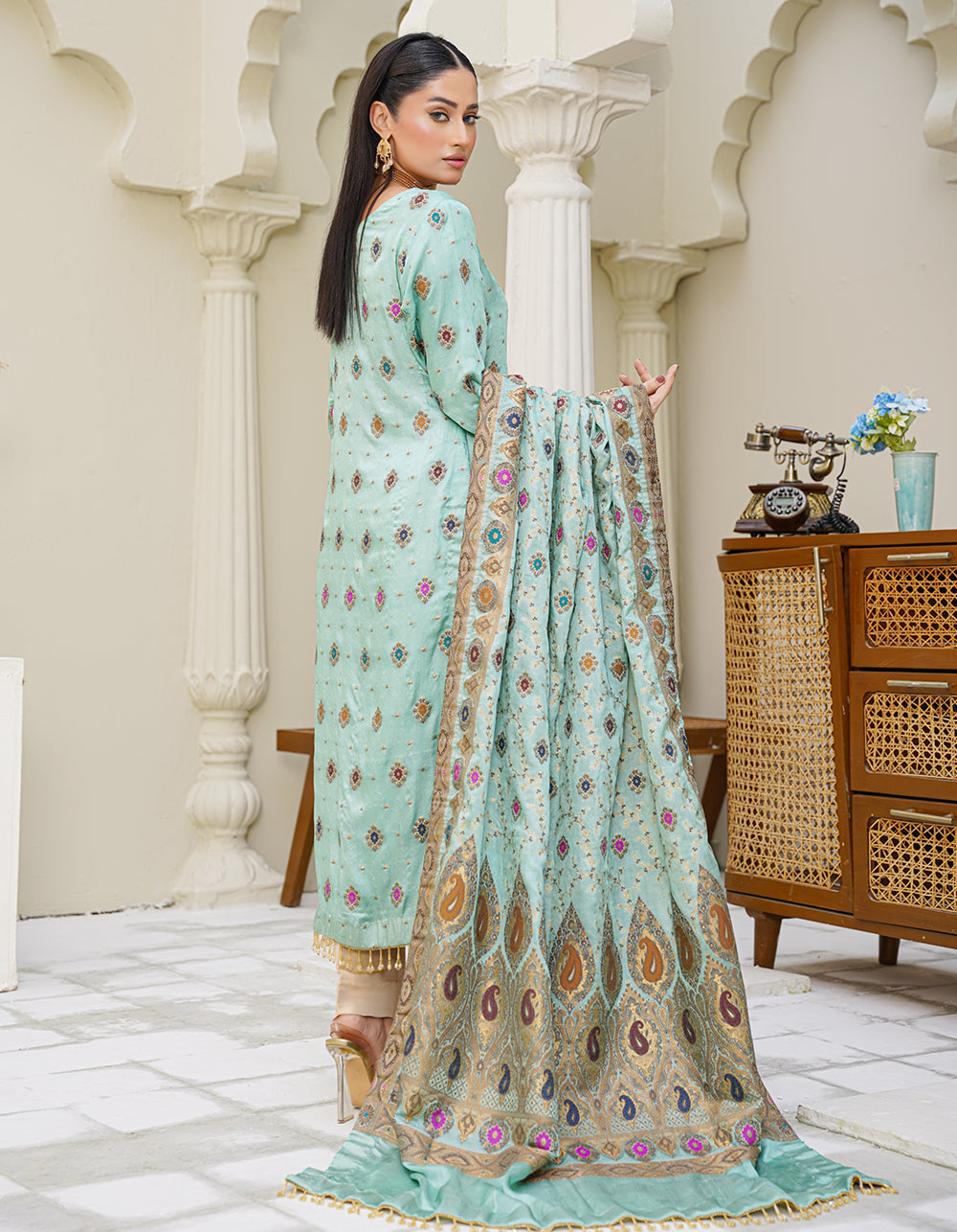 A refreshing aqua-toned suit with elegant daman multi-thread and zari work. Paired with a Mughal-style shawl that enhances its regal aesthetic.