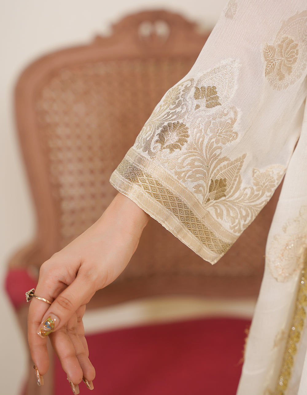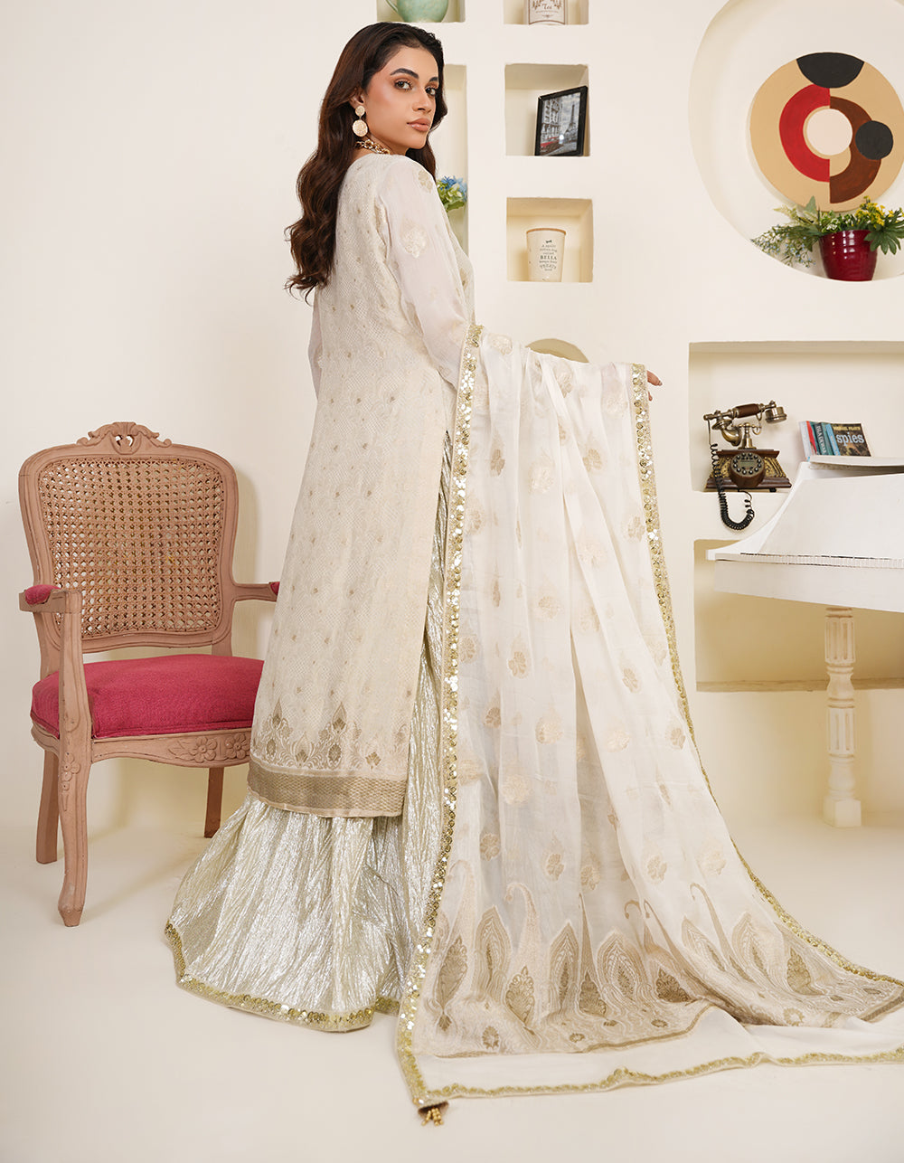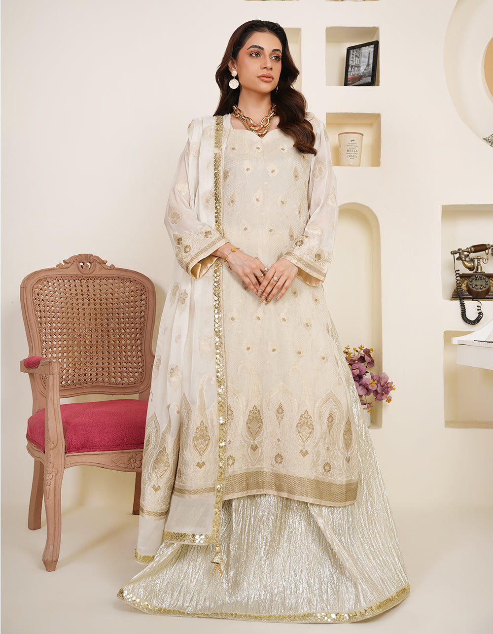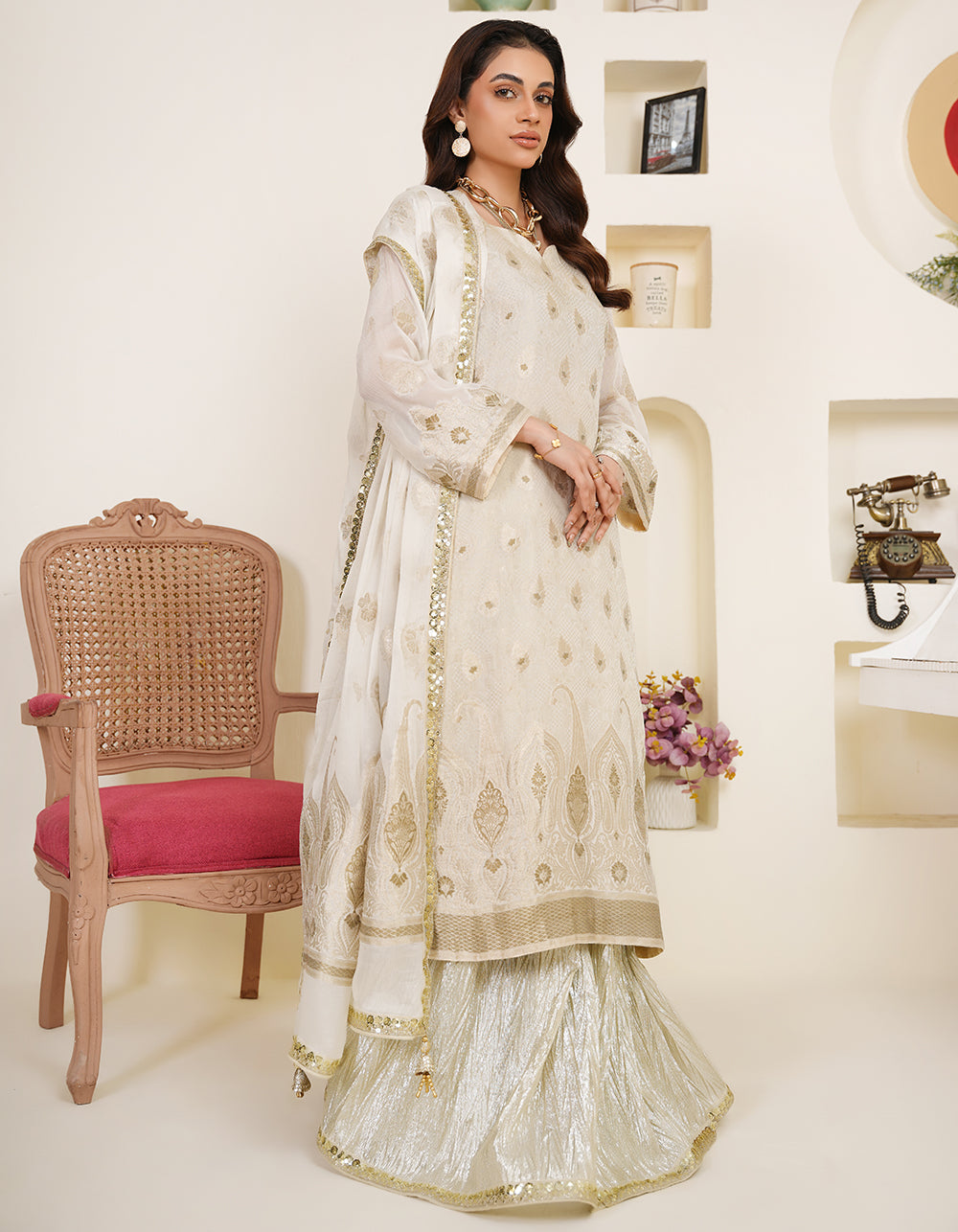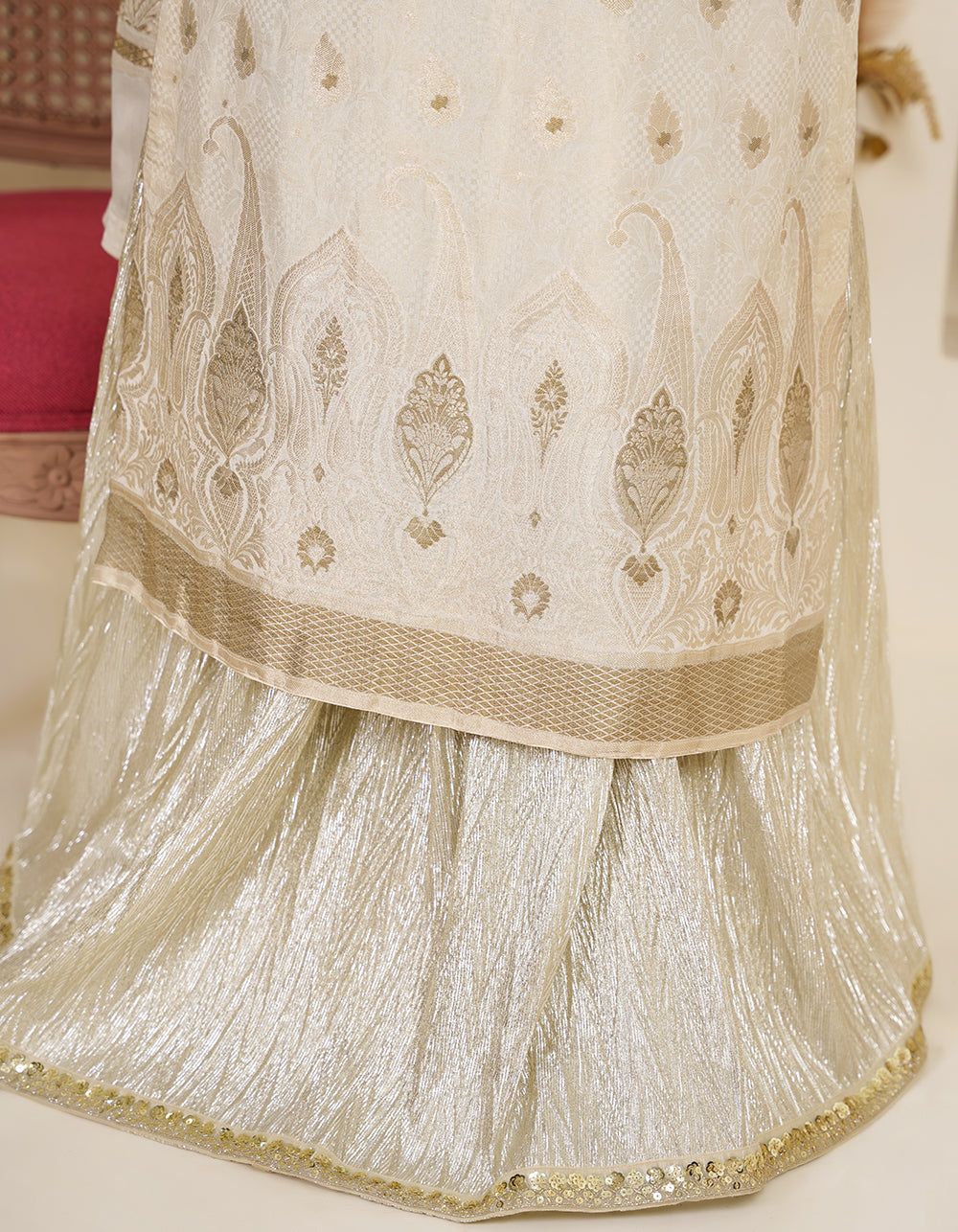 A pristine off-white Suchi Zari suit featuring delicate self-zari on the shirt. Light gold antique accents add a soft, sophisticated glow.