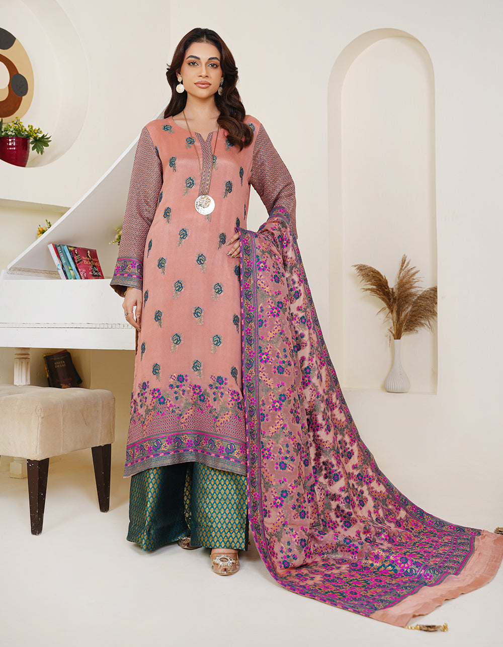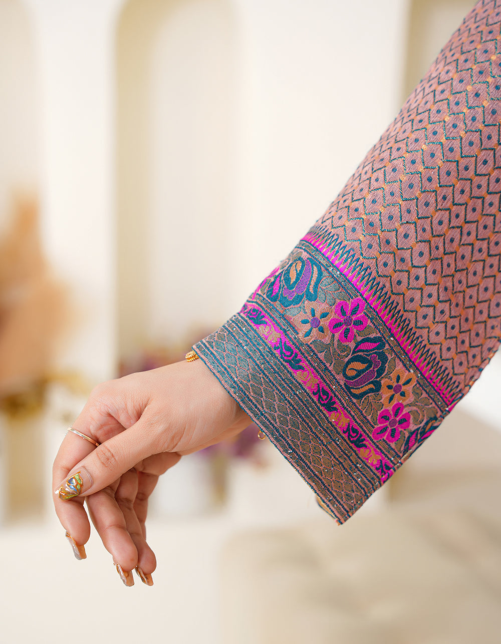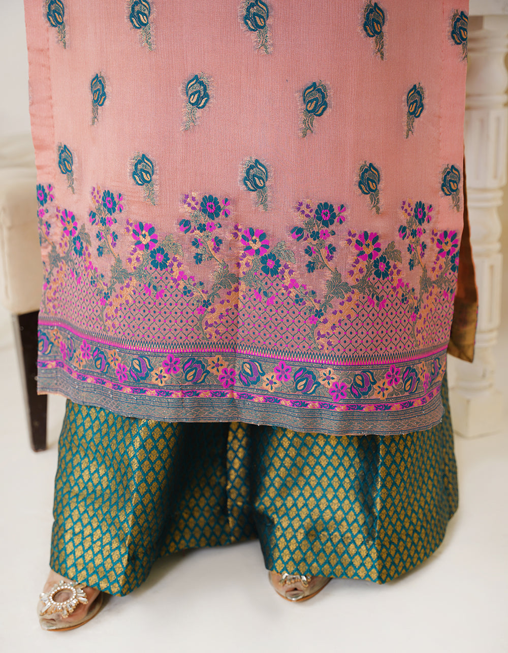 A graceful tea-pink Kanni chiffon suit with a multi-thread and zari shawl. Floral jal daman and atlas sleeves add charm to this refined outfit.