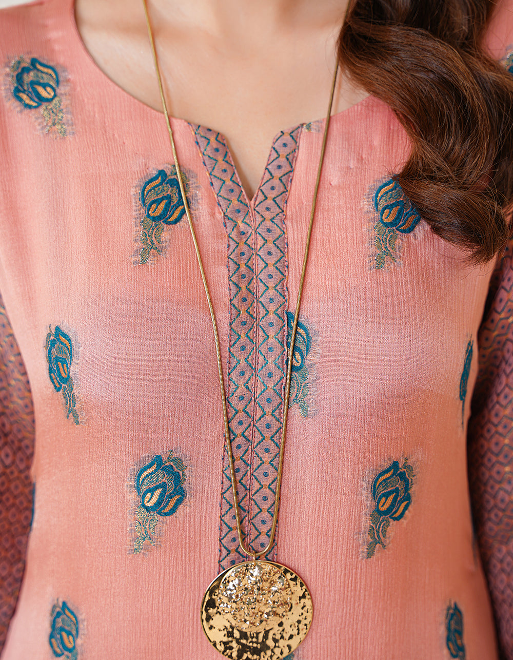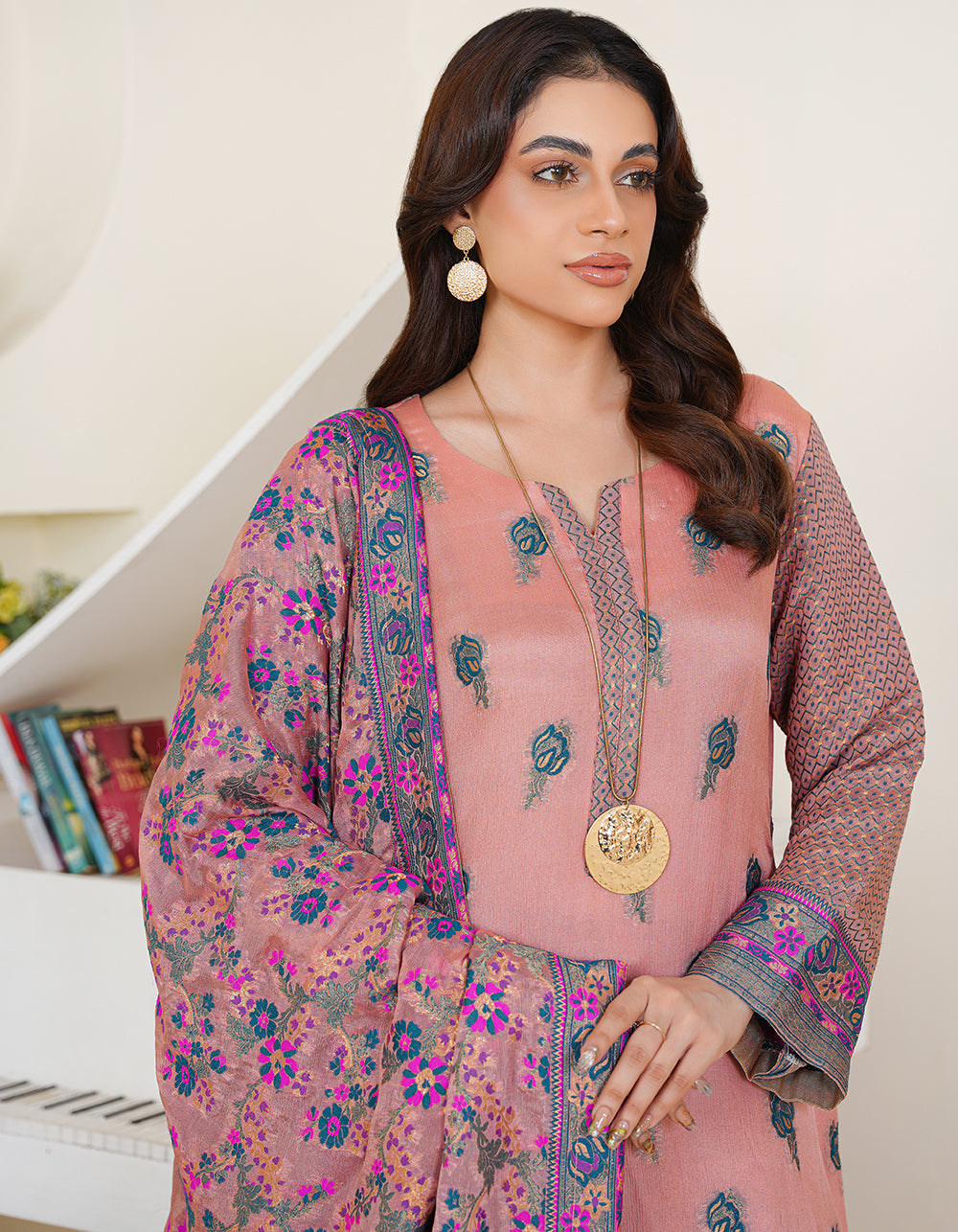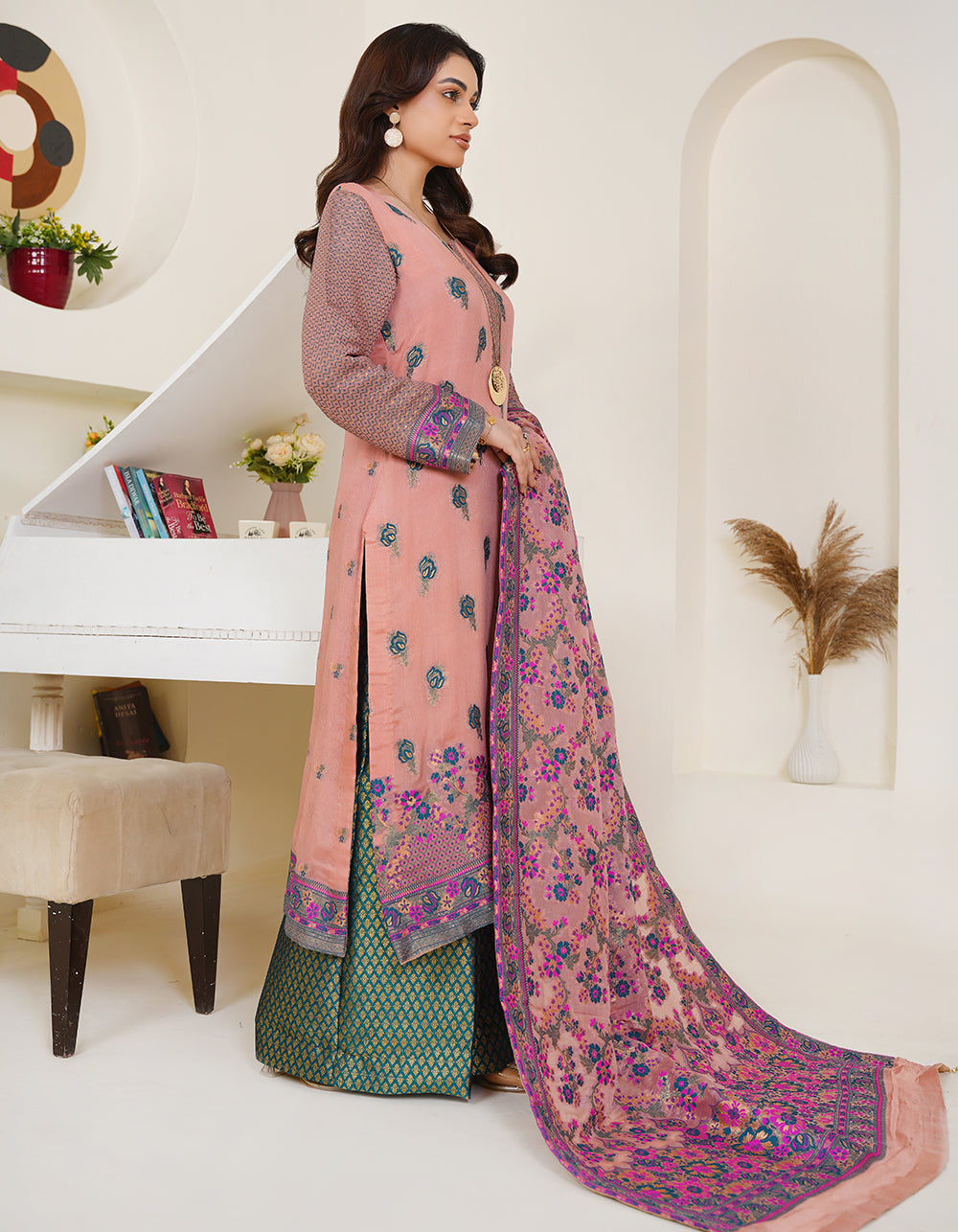 A graceful tea-pink Kanni chiffon suit with a multi-thread and zari shawl. Floral jal daman and atlas sleeves add charm to this refined outfit.