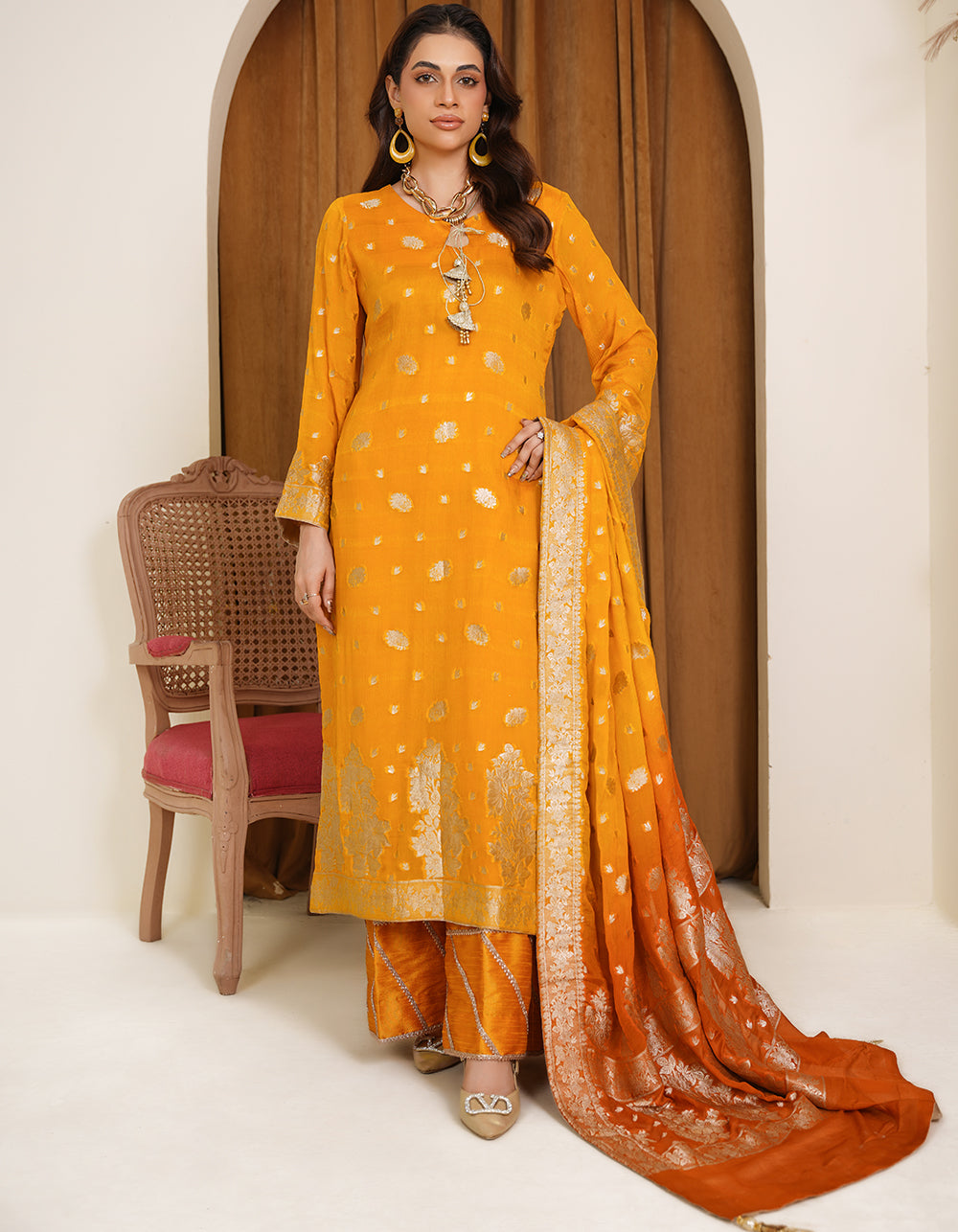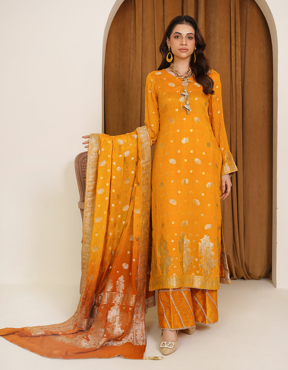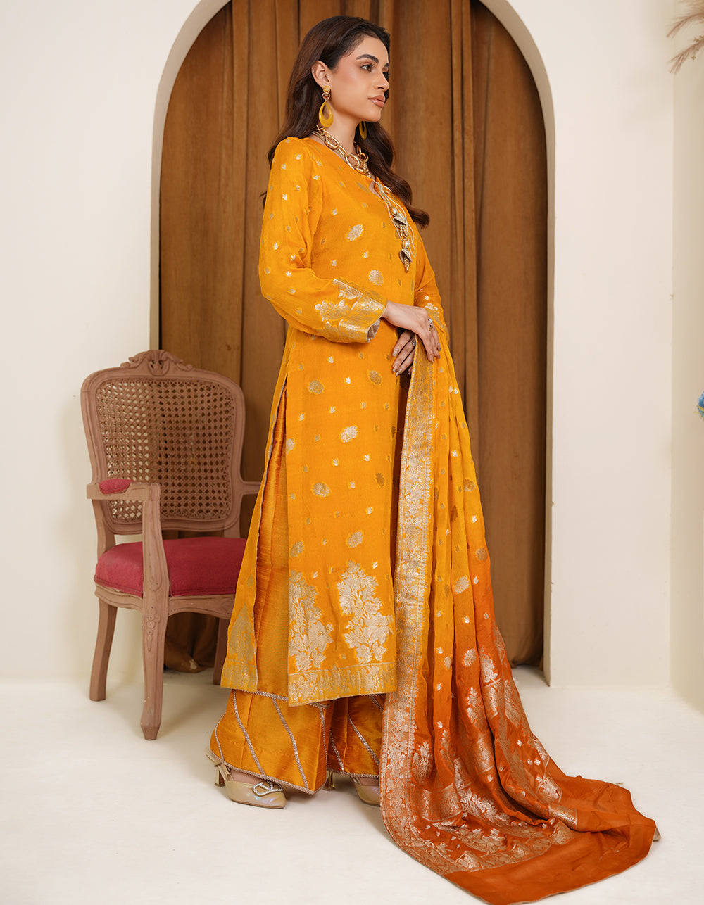 A vibrant yellow and rust combination enhanced with rose-gold zari accents. The 3-shaded chiffon shawl adds a striking and artistic touch.