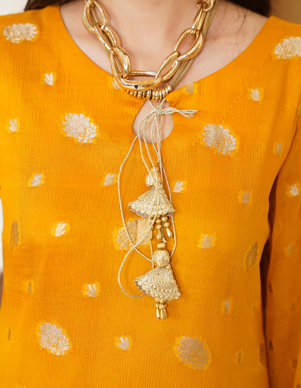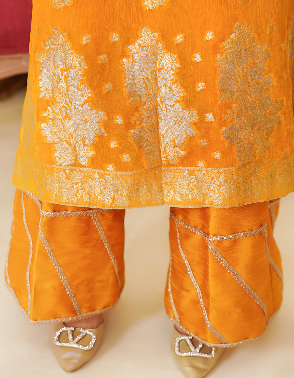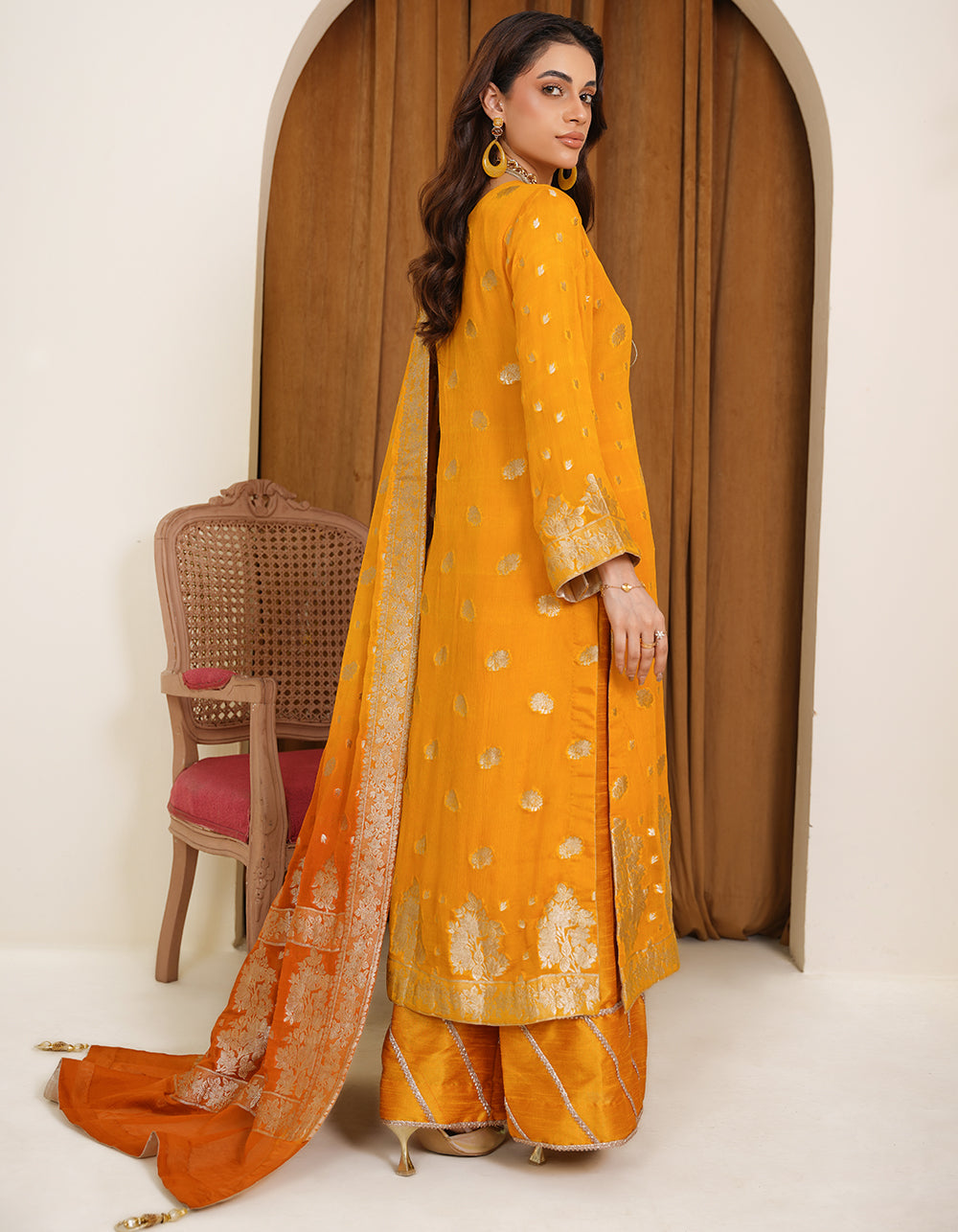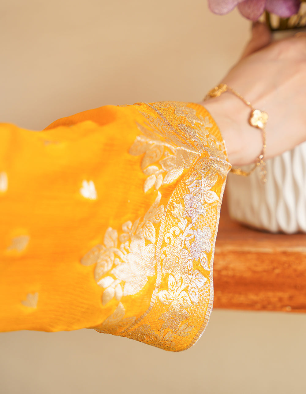 A vibrant yellow and rust combination enhanced with rose-gold zari accents. The 3-shaded chiffon shawl adds a striking and artistic touch.