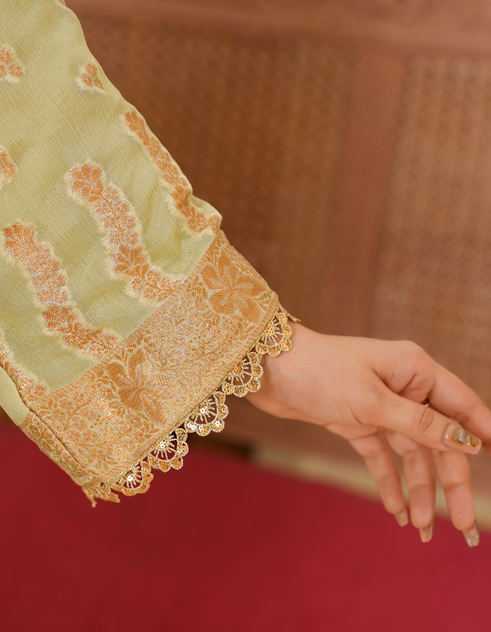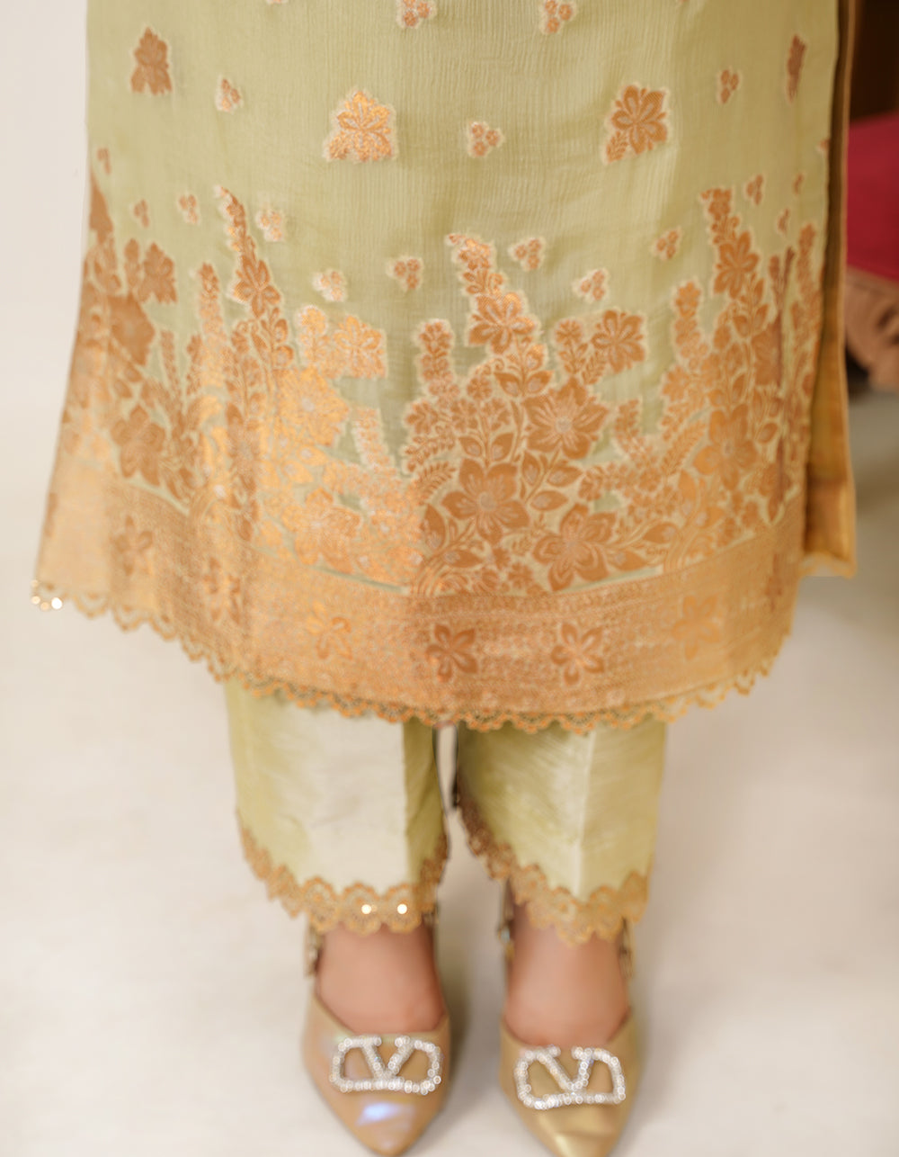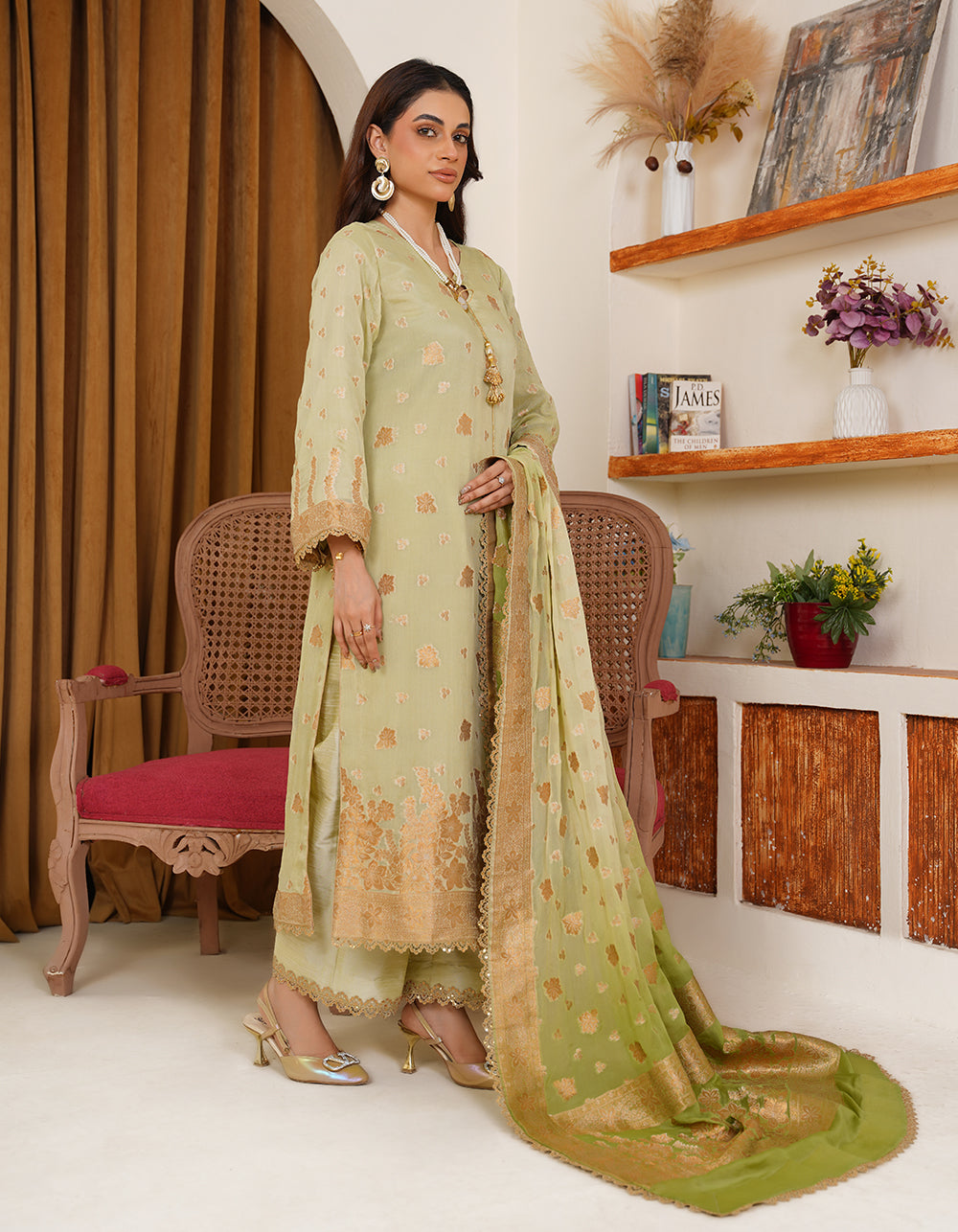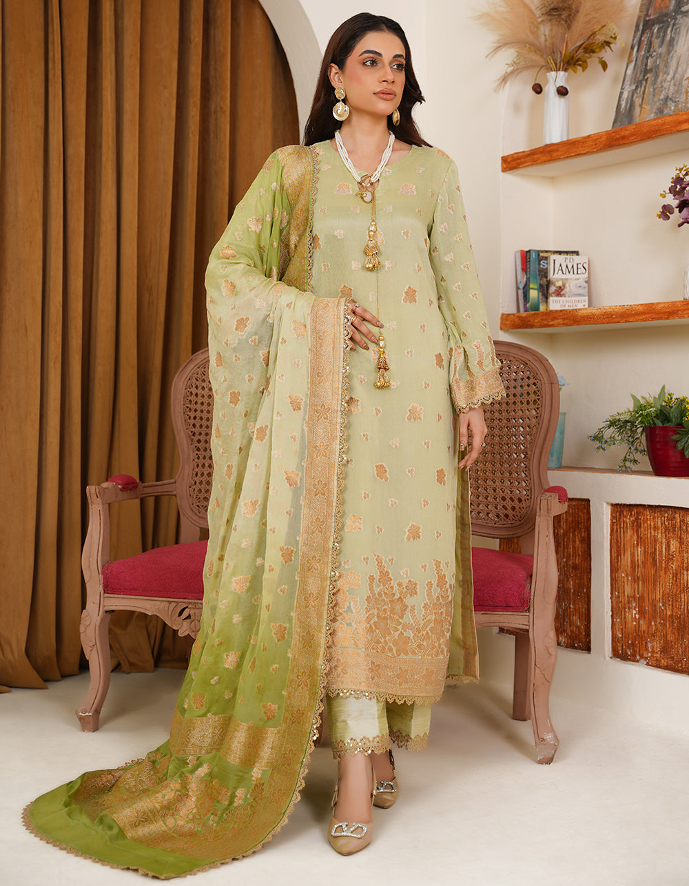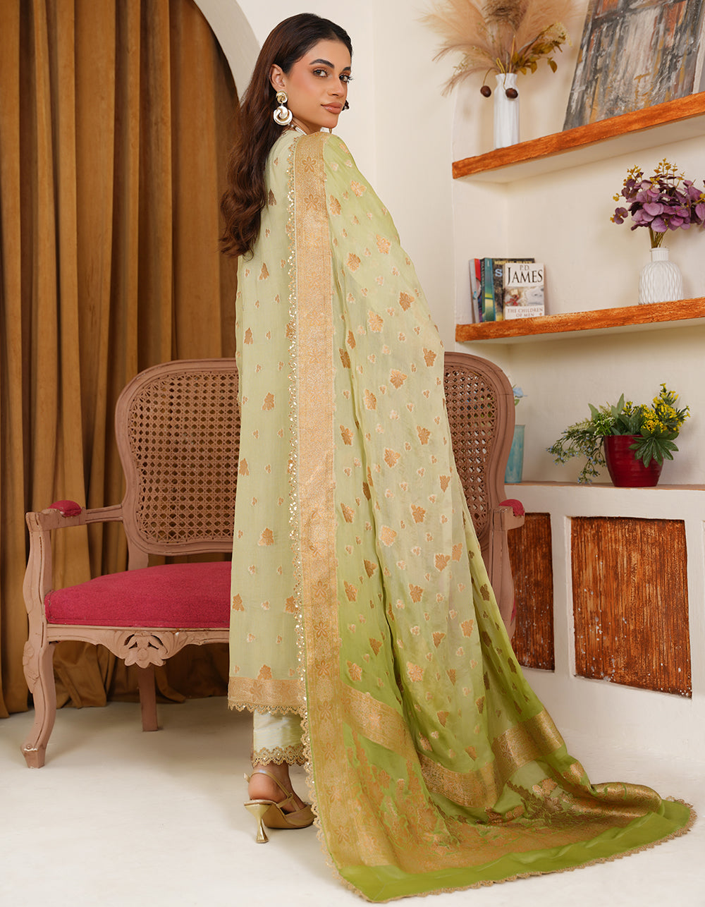 A dual-pista shaded ensemble adorned with elegant Ganga-Jamna zari. The 3-shaded shawl enhances its sophisticated Banarasi charm.