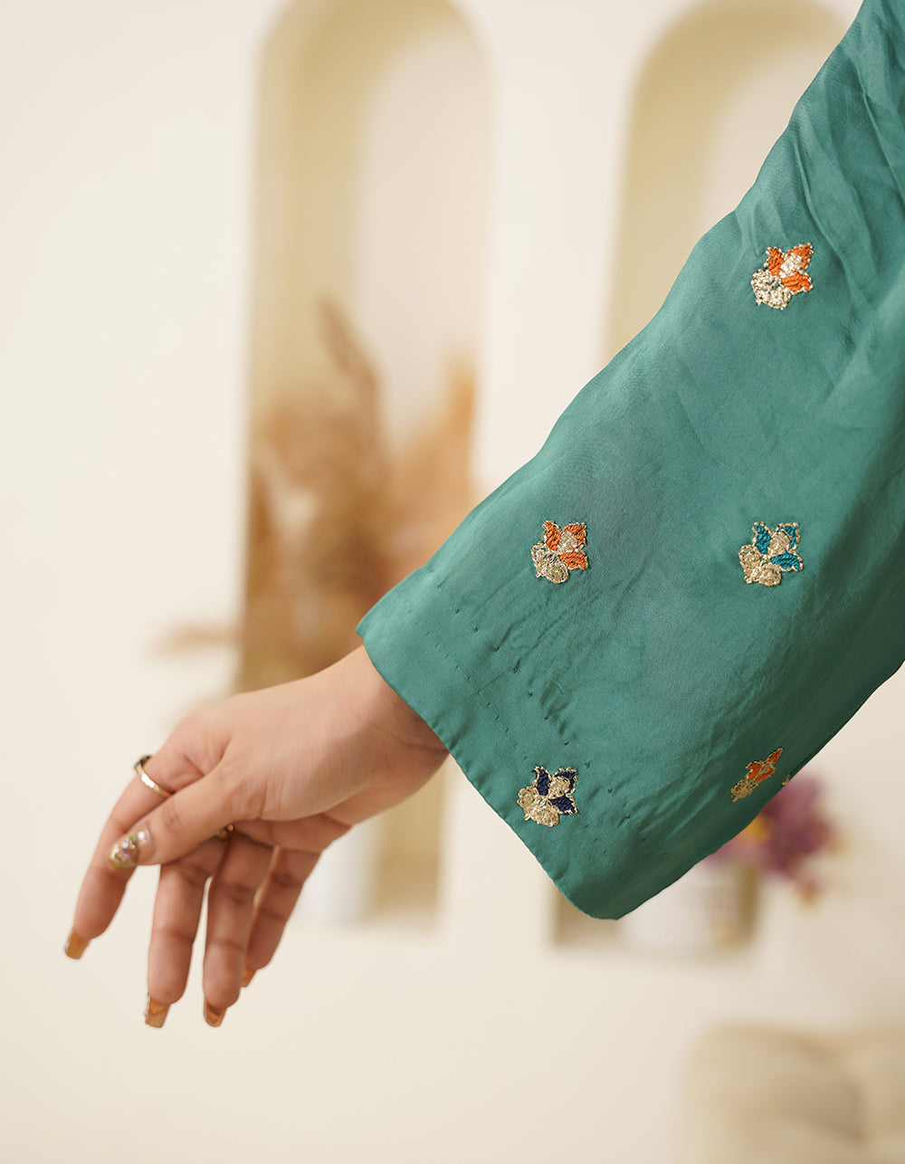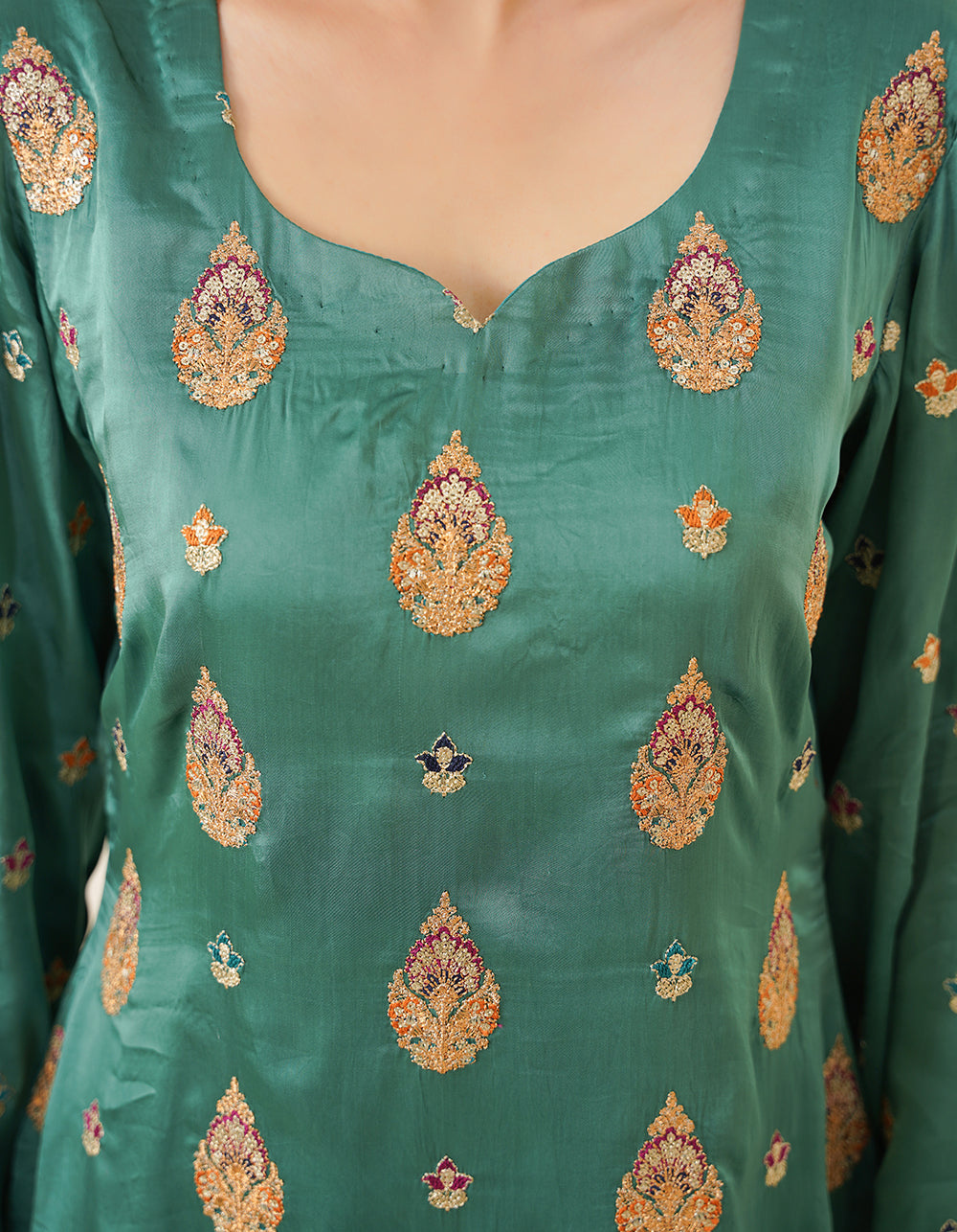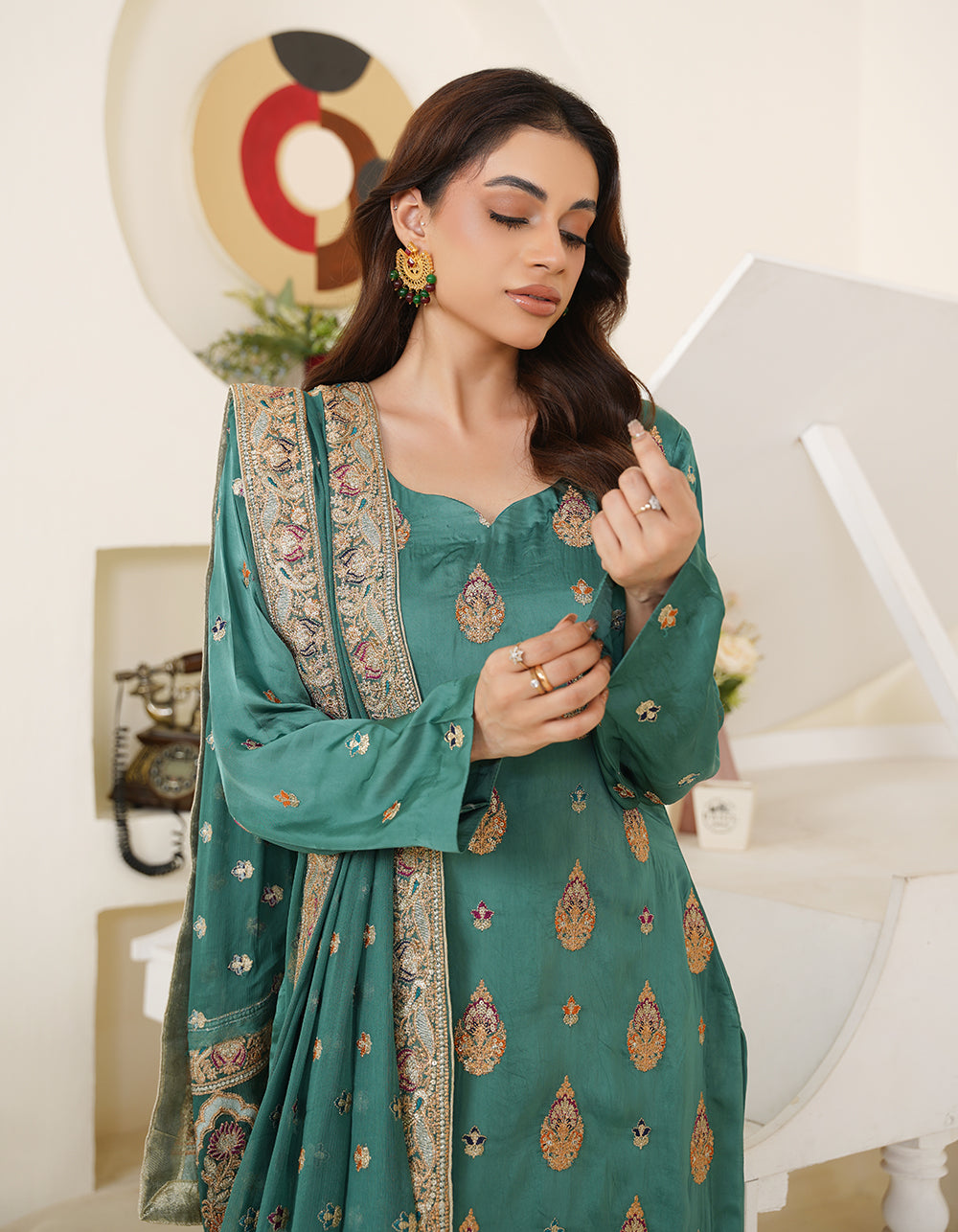 A mid-green shamoos silk outfit adorned with multi-head embroidery and zari. Comes with a chiffon shawl showcasing detailed multi-thread artistry.