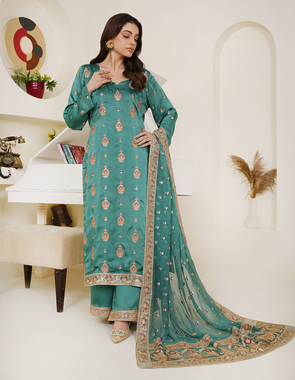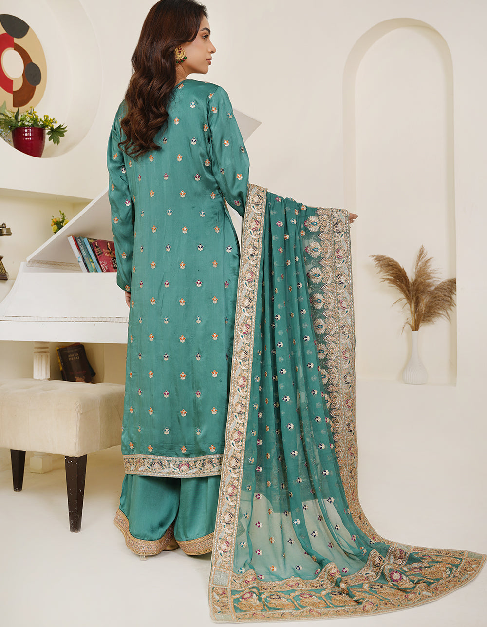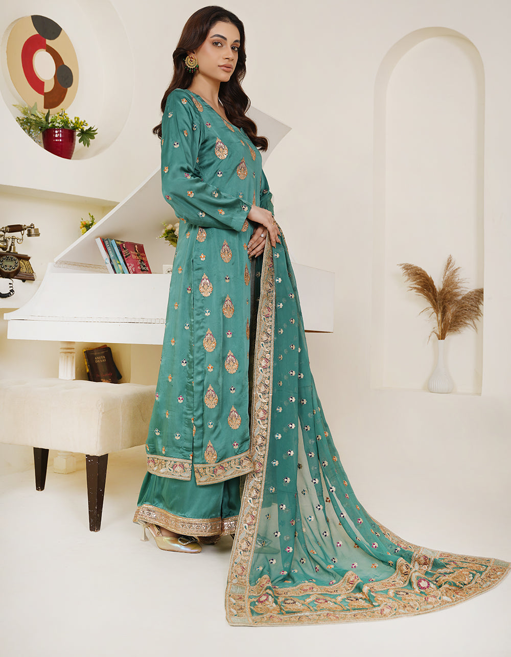 A mid-green shamoos silk outfit adorned with multi-head embroidery and zari. Comes with a chiffon shawl showcasing detailed multi-thread artistry.